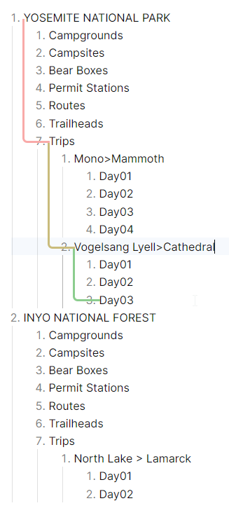What I would like subfolders for is so that I can create a root folder for a permit domain (e.g. Yosemite National Park) and then create subfolders for the different routes/trips + classes of objects above. The current system makes is so I have to choose EITHER a root Yosemite folder with all classes included and visible at once OR a group of root Yosemite folders in order to make such objects selectively visible. Basically, I have to choose whether I want clutter in the nav pane or clutter inside the folders
