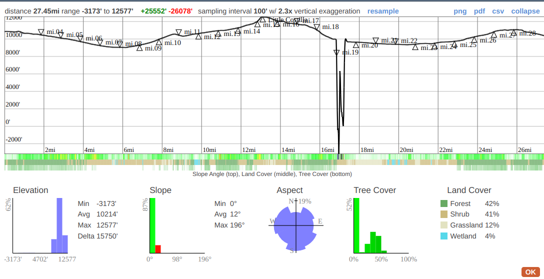 Exhibit A. Nothing about this elevation profile is accurate. Although you can accurately guess where the track enters and exits the glitch in the matrix, like a black hole the glitch influences elevation data over a wide arc beyond its visible sphere. Even light or tangible illumination of this particular Caltopo bug can never escape its gravitational pull.