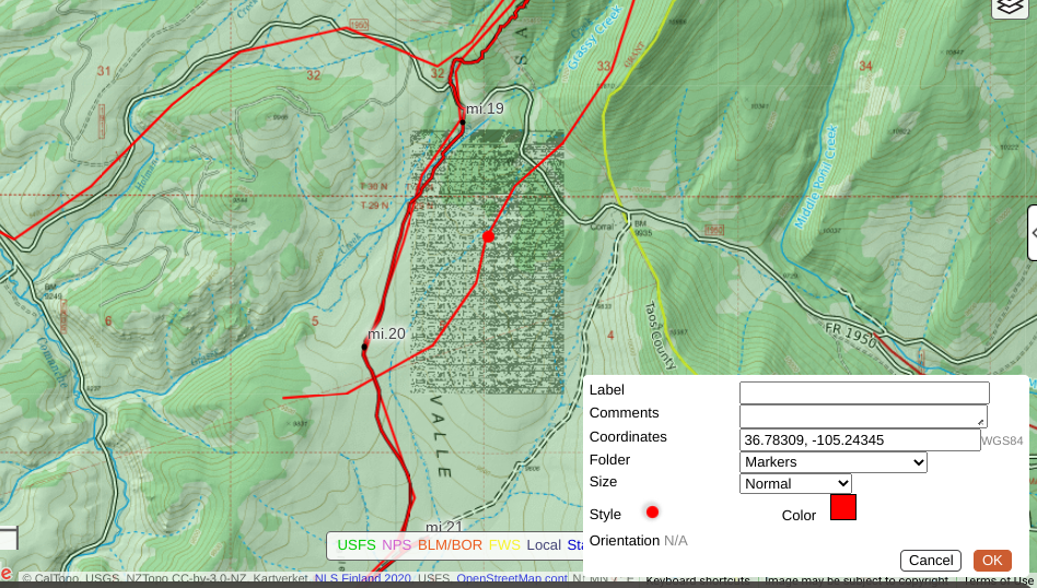 There's a glitch in the matrix, shown below, in the Valle Vidal region of the Carson National Forest in northern New Mexico. The screen shot shows a waypoint for reference. Any track, route, or line that intersects (passes through, even briefly) the glitch region (rectangle shown) produces a wonky and wildly inaccurate elevation profile. The problem is not specific to a certain map or layer. You won't see it until zooming out a few levels.