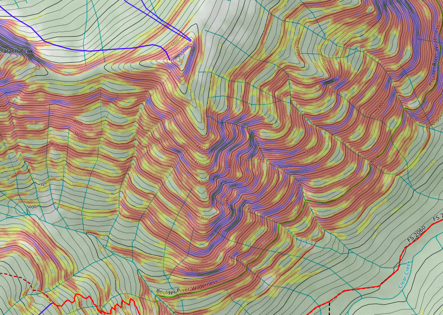In a few locations I've noticed DEM slope angle shading showing some unnatural looking bands of steeper terrain, aligning with bold 200' contour lines on the map. See images below of the North Cascades in Washington (48.17532, -121.61394). Something looks wrong about it. I'm curious if other people have noticed a similar issue, and if so what the source of this could be?