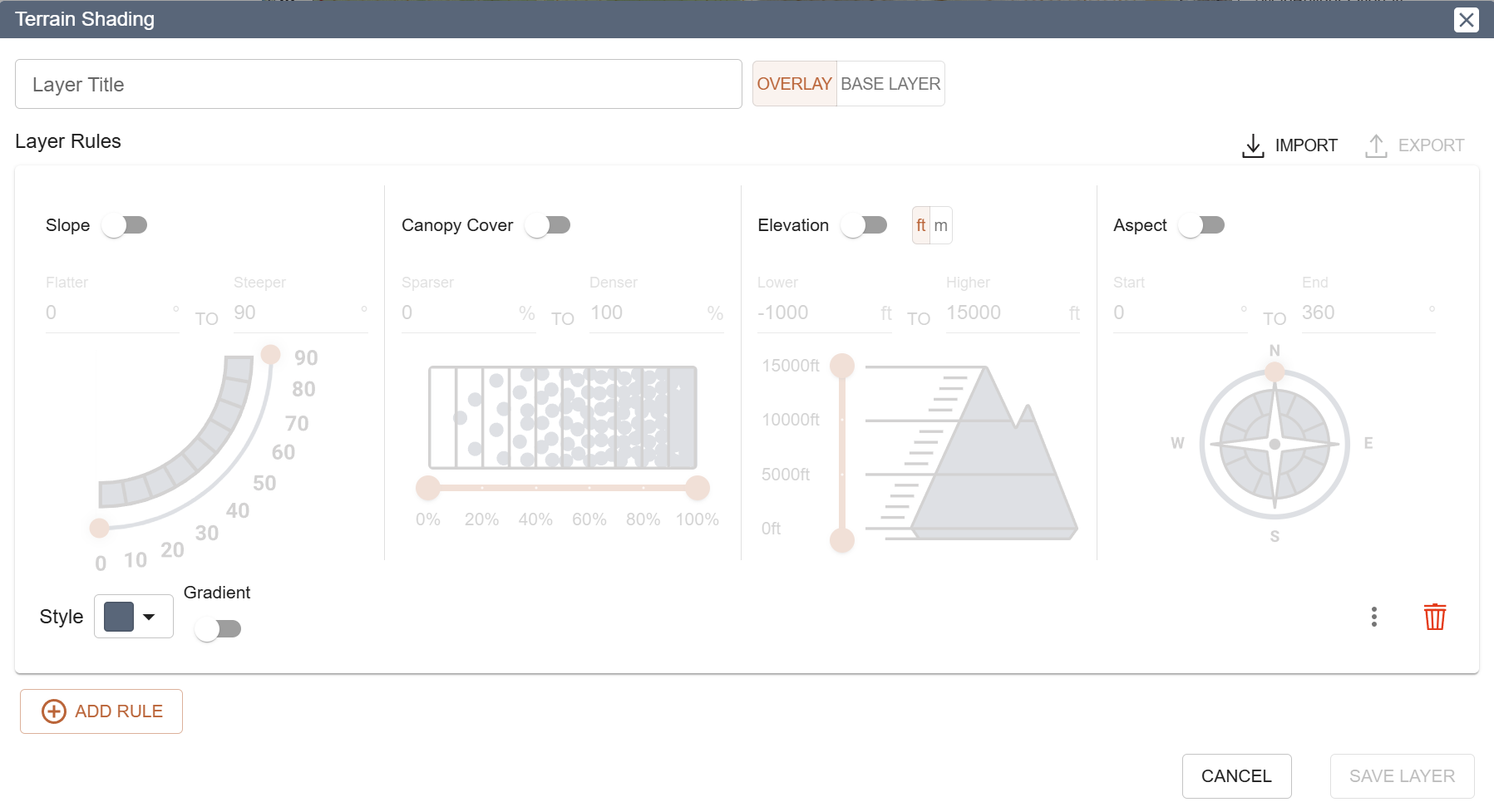 Jumping in as a longtime CalTopo user who just noticed the new Terrain Shading Interface. I've been making Terrain Shading layers for many years, mainly elevation/slope maps with multiple rules. At first glance, the redesign is a huge visual and ease-of-use upgrade, especially for newer users. There are many different ways to use this tool, but I have a few comments based on my use cases: