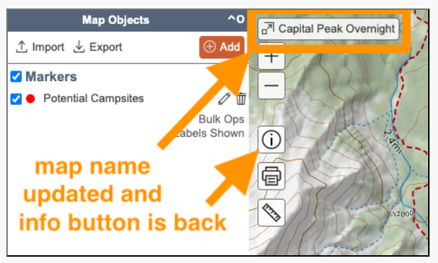So the "border" of the "map" is just that extent to which it contains all the objects. You can view the "border" of your "map" by clicking the name of the map in the top left of the map view which sets the zoom level so it shows you all visible objects. In this example, you would click "Capital Peak Overnight" and the map view would set the zoom level so you would see all the objects (markers, lines, polygons) you selected to view.