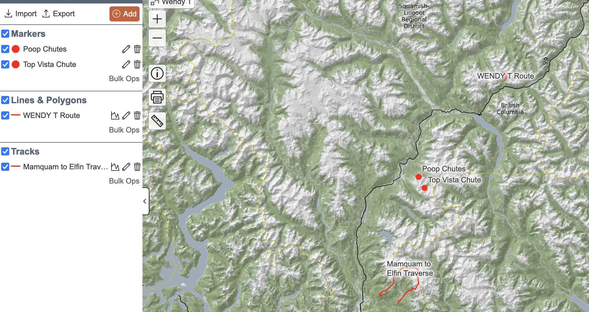 I can see all the items on the Wendy T map. When I click on Wendy Route and the Mamquam traverse on your map it just offers to show me the Terrain Stats, Profile and the Travel Time. It does not offer to add to my map. (That only happens on my map with my own objects).